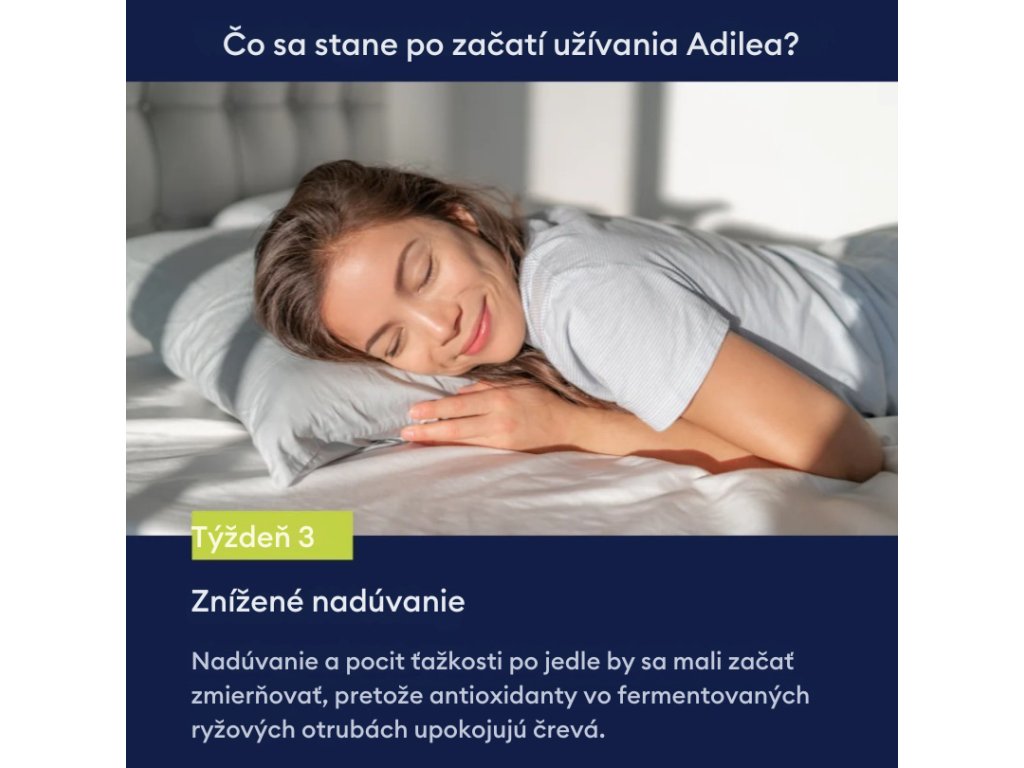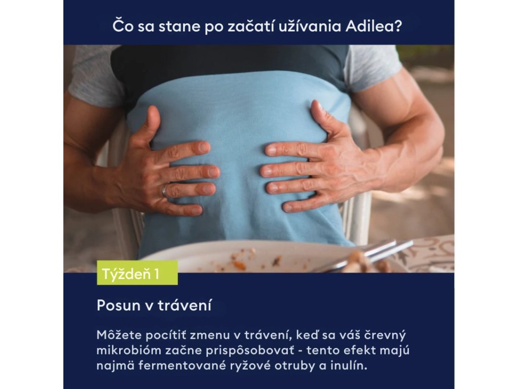 Názov: Výživový doplnok adileum. Obsahuje metabolity z fermentovaných ryžových otrúb, ktoré môžu upokojiť podráždený žalúdok a prispieť k zlepšeniu kvality života, celkovej pohody a zdravia. Neobsahuje lepok, mliečne výrobky ani sóju.