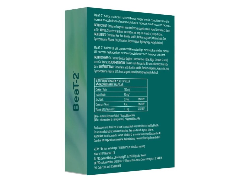 BeaT-2™ pomáha udržiavať prirodzenú hladinu cukru v krvi, prispieva k normálnemu metabolizmu makroživín, znižuje únavu a vyčerpanosť.